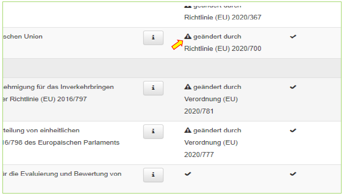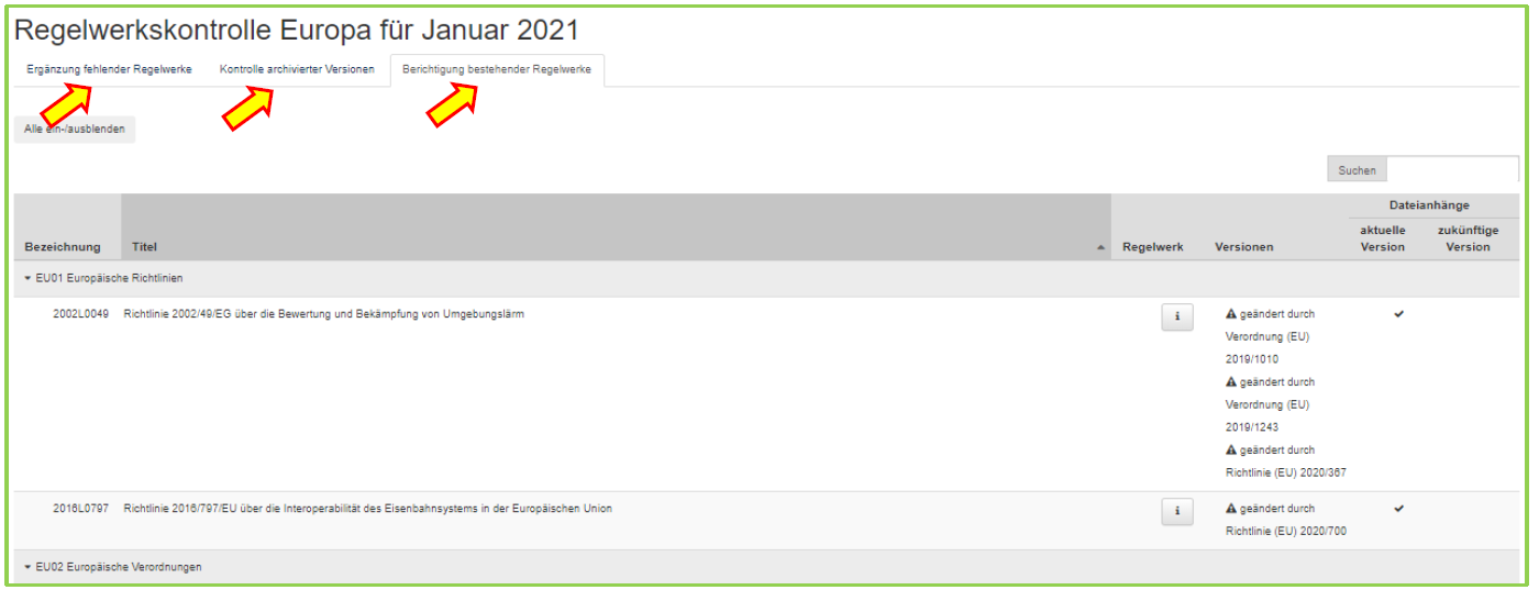 In diesem Reiter ist eine Liste mit Regelwerken enthalten, die gemäß Kontrollturnus oder aufgrund besonderen Anlasses zu kontrollieren waren. Die Kontrolle umfasst dabei ausschließlich die aktuellen Regelwerke, also keine vollständig archivierten Regelwerke. Kontrolliert werden dabei aktuelle und zukünftige Versionen auf folgende Aspekte: