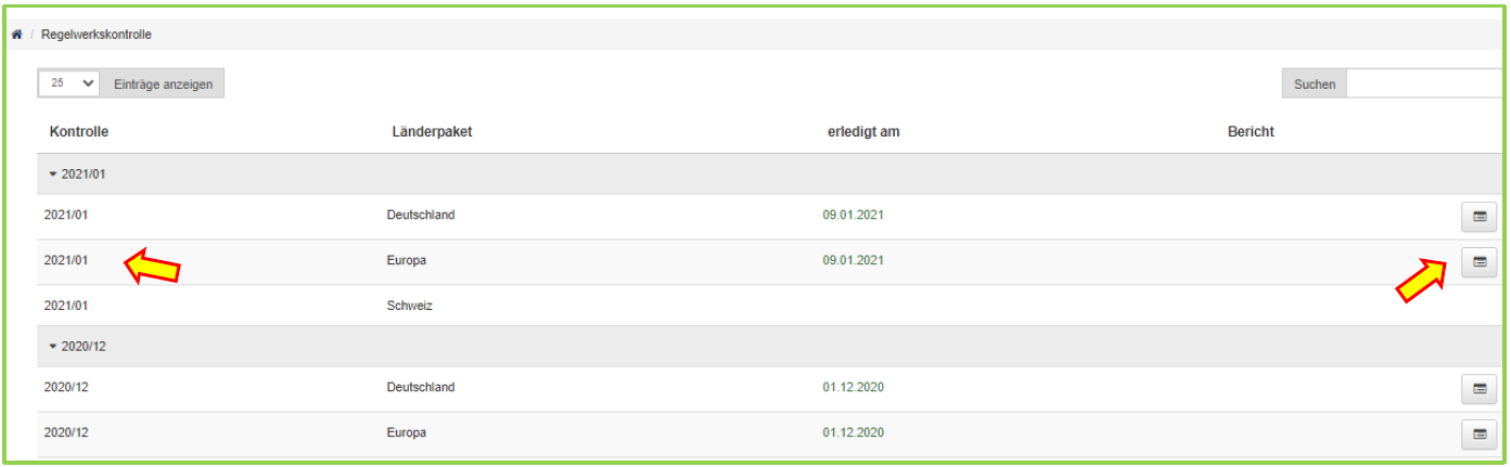 In diesem Reiter wird die Liste mit den Berichten der regelmäßig durch KSV durchgeführten Regelwerkskontrollen angezeigt. Die Regelwerkskontrollen werden durch monatlich in Form von Stichproben durchgeführt, wobei sie sich ausschließlich auf die von KSV bereitgestellten Datensätze erstrecken. Für jedes Länderpaket werden getrennte Berichte bereitgestellt. Sobald ein Bericht verfügbar ist, kann dieser über die entsprechende Schaltfläche (Listensymbol-Symbol) angezeigt werden. Gehen Sie zur Auflistung (Bericht) je Länderpaket: