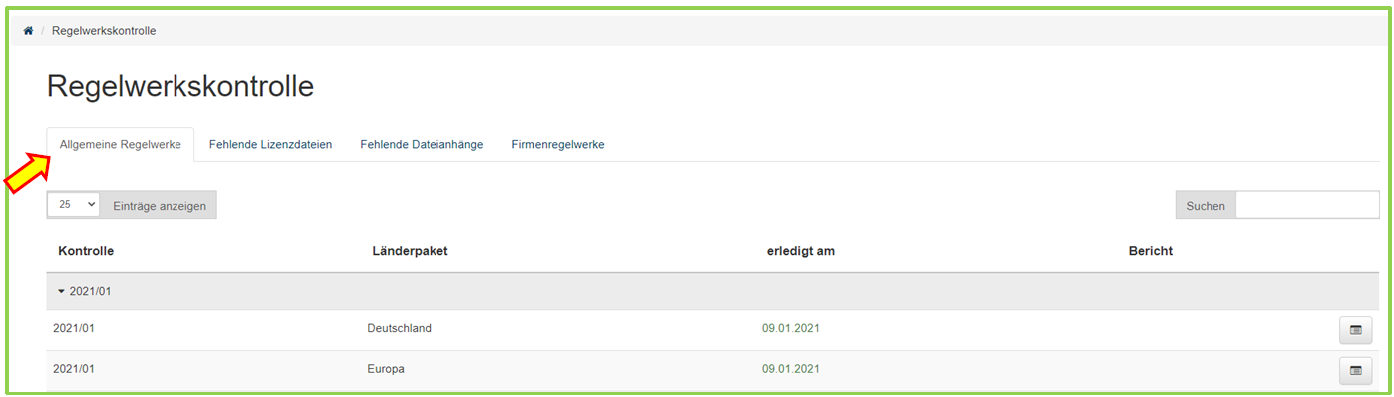 Gehen Sie zum Menüpunkt „Regelwerkskontrolle“ -> Reiter „Allgemeine Regelwerke“ und wählen Sie das Länderpaket nebst Kontrollmonat: