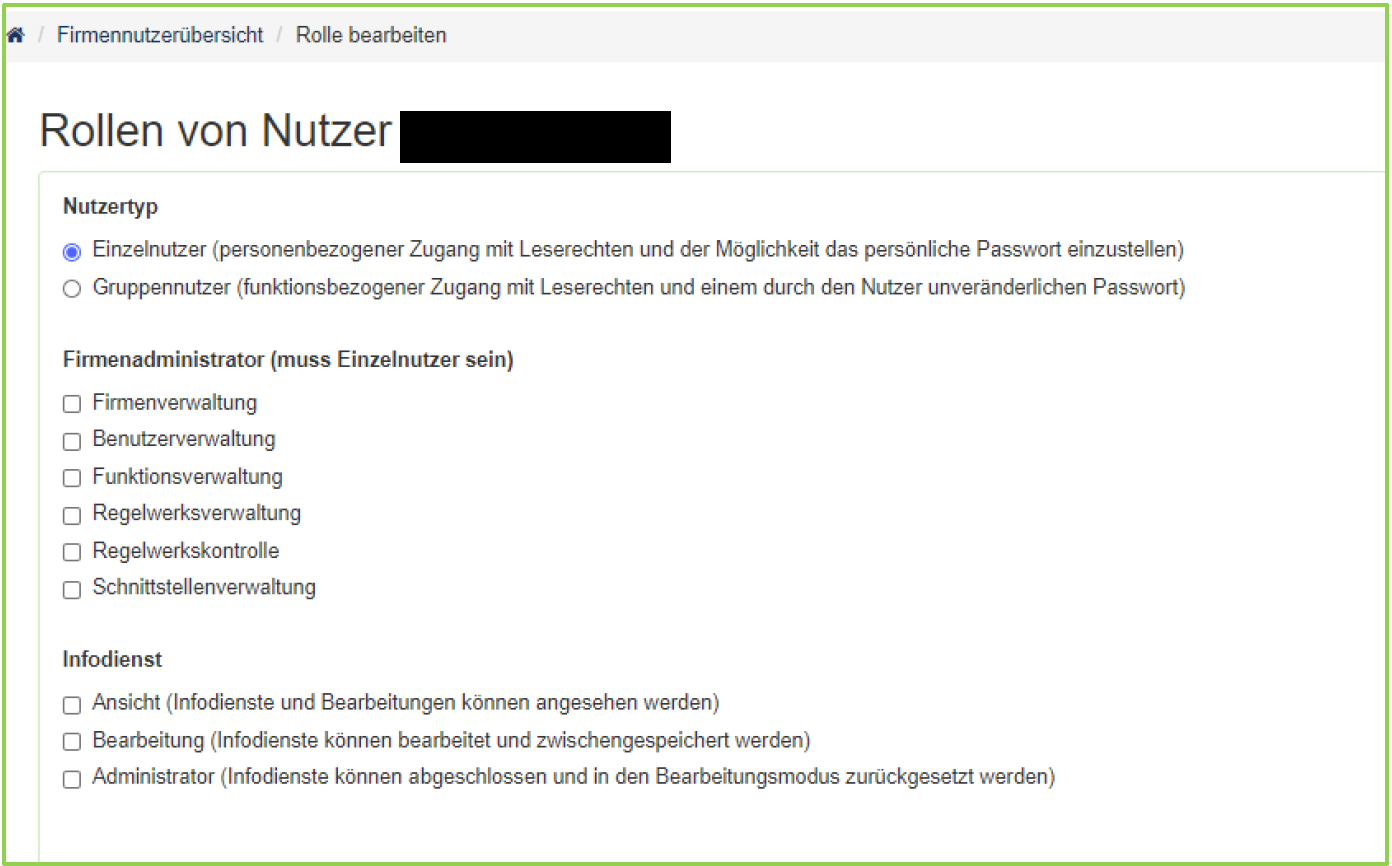 Nach dem Anlegen eines neuen Benutzers müssen diesem die erforderlichen Berechtigungen (Rollen) zugewiesen werden. Andernfalls steht dem Benutzer nicht die volle (beabsichtigte) Funktionalität des Regelwerksmanagers zur Verfügung. Auf der entsprechenden Seite sind die Rollen und Abhängigkeiten kurz beschrieben (siehe Abbildung).