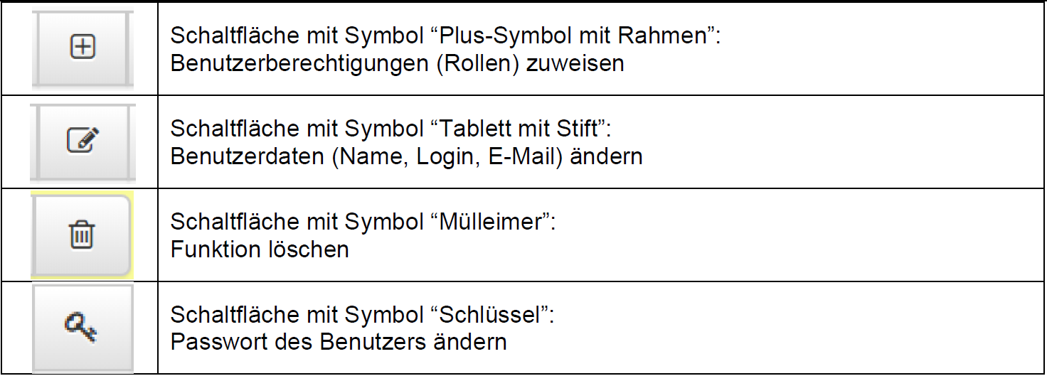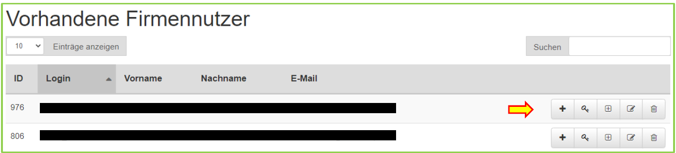 Im unteren Bereich der Benutzerverwaltung befindet sich die Übersicht mit den Benutzern, die der Firma zugewiesen sind. Über die Schaltflächen können die einzelnen Benutzer weiterbearbeitet oder auch wieder gelöscht werden: