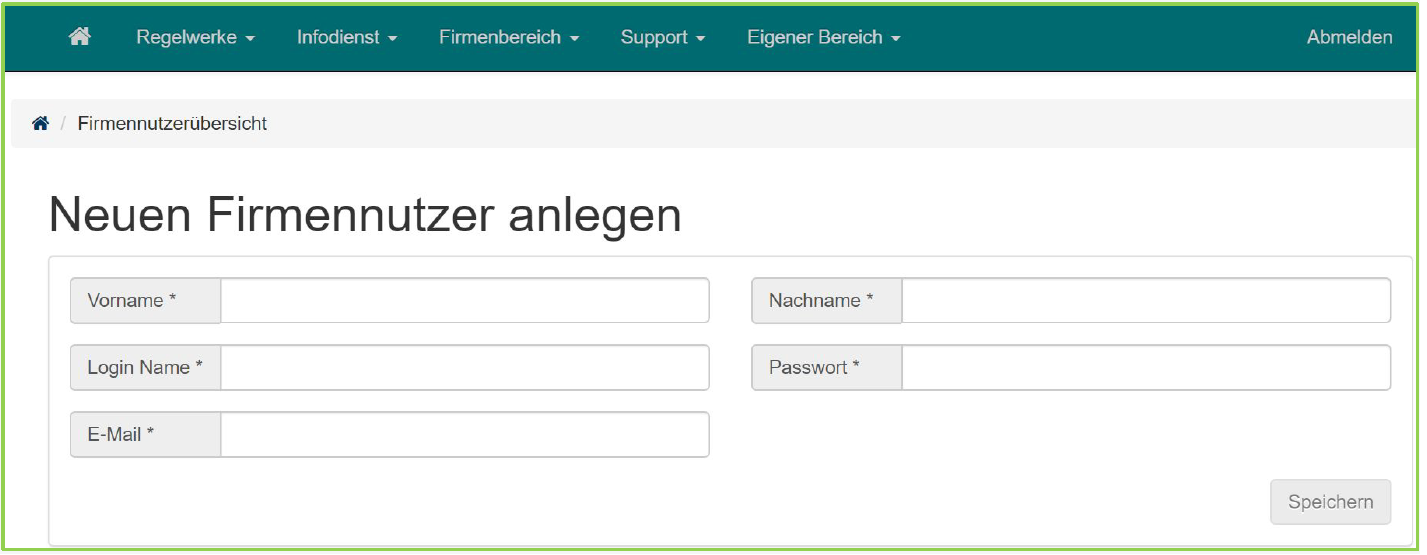 Im oberen Bereich der Benutzerverwaltung befindet sich die Eingabemaske für das Anlagen eines neuen Benutzers mit den dafür erforderlichen Eingabefeldern. Alle Eingabefelder sind Pflichtfelder. Der Benutzer wird beim Speichern automatisch der betreffenden Firma zugewiesen und steht für die weitere Bearbeitung (insbesondere Vergabe der Berechtigungen und Zuweisung der Firmenfunktionen) zur Verfügung.