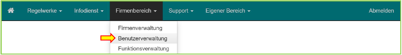 Benutzer mit der Berechtigung als Firmenverwaltung können eigenständig die Benutzer ihrer Firma verwalten. Diese Verwaltung ermöglicht es, weitere Benutzer anzulegen, zu bearbeiten und zu löschen. Dabei können auch die unterschiedlichen Berechtigungen der Benutzer eingestellt werden. Die Benutzerverwaltung kann über den entsprechenden Menüpunkt im Firmenbereich (siehe Abbildung) aufgerufen werden.