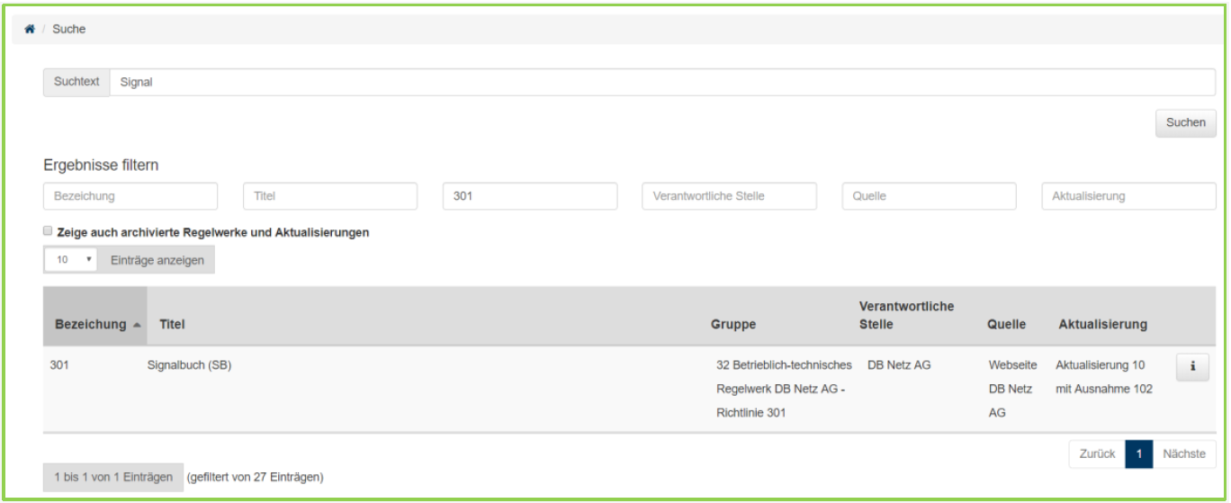 Im Feld „Suchtext“ kann ein beliebiger Text (auch Datum im deutschen Format) eingegeben werden, der in den Eigenschaften der Regelwerke und Aktualisierungen gesucht werden soll. Die Suchanfrage ist anschließend durch Klicken der Schaltfläche „Suchen“ abzusenden. Alle Suchergebnisse werden dann in der Liste unten aufgeführt. Diese Ergebnisse können dann über die Eigenschaften „Bezeichnung“, „Titel“, „Gruppe“, „Verantwortliche Stelle“, „Quelle“ und „Aktualisierung“ gefiltert werden. Das in der Abbildung dargestellte Beispiel zeigt die Regelwerke, in denen das Wort „Signal“ vorkommt und in der Gruppe mit dem Text „301“ eingestellt sind.