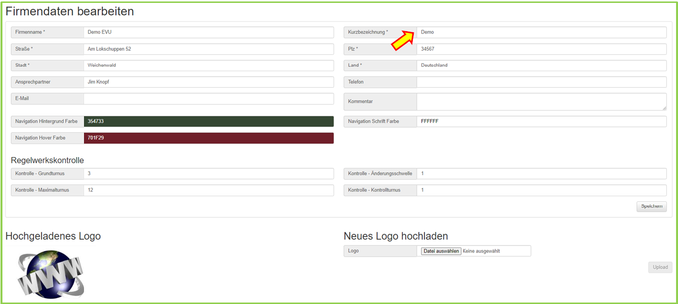 Auf der neu angezeigten Seiten können die Stammdaten bearbeitet werden und Einstellungen zum Layout der Anzeige (Farbe der Menüleiste, Schriftfarbe des Menü, Firmenlogo) vorgenommen werden. Stellen Sie an dieser Stelle die Zeiträume für die Regelwerkskontrolle ihrer eigenen Firmenregelwerke ein.(siehe Regelwerkskontrolle -> Einstellungen zum Kontrollturnus).
