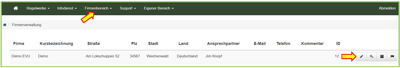 Gehen Sie dazu zum Menüpunkt Firmenbereich > Firmenverwaltung und drücken die Schaltfläche: