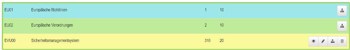 Wie bereits bei Regelwerken bekannt, befinden sich auf der rechten Seite jeweils Schaltflächen, mit denen unterschiedliche Operationen für die jeweilige Gruppe ausgelöst werden können. Der Umfang der Schaltflächen richtet sich dabei nach dem Typ der Gruppe: