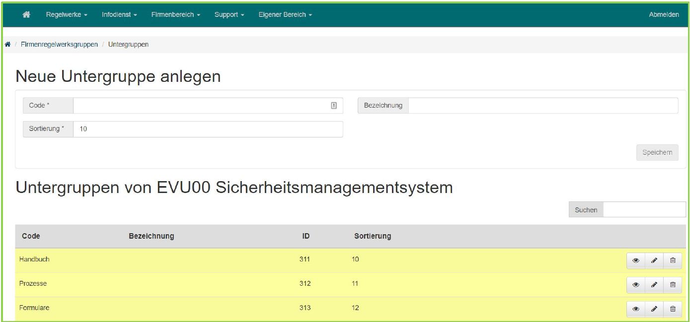 Im oberen Bereich befindet die Eingabemaske, mit der neue Untergruppen durch die Firma angelegt werden können. Die Bedeutung und Eingabe der Eigenschaften erfolgt analog wie bei den Gruppen, wobei die Eigenschaft “Bezeichnung” bei Untergruppen nur optional ist.