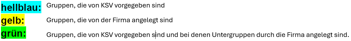Bislang werden die Gruppen und Untergruppen gemäß ihrer “Bezeichnung” benannt. Die Bezeichnung der Gruppe und Untergruppe beinhaltet in den meisten Fällen auch einen numerischen Schlüssel, wodurch eine einfach Sortierung der Gruppen und Untergruppen erfolgt. Mit der Implementierung der Länderpakete Schweiz und Österreich ist es jedoch erforderlich, den numerischen Schlüssel, den eigentlichen Namen und die Sortierung in unterschiedlichen Eigenschaften für jede Gruppe zu führen. Dazu dienen die oben beschriebenen Eigenschaften “Code”, “Bezeichnung” und “Sortierung”. Die Codes der Gruppe und Untergruppe, die durch KSV direkt vorgegeben werden, stellen wir in nächster Zeit um. Sie orientieren sich zukünftig am Länderpaket: