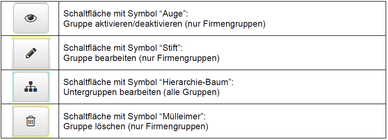 Im unteren Bereich befindet sich die Liste mit den vorhanden Untergruppen. Die Farbcodierung ist analog wie bei den Gruppen, wobei es bei Untergruppen nur hellblau und gelb gibt, da keine Untergruppen zu Untergruppen vorgesehen sind. Es stehen Schaltflächen mit den Optionen “Aktivieren/Deaktivieren”, “Bearbeiten” und “Löschen” für Firmengruppen zu Verfügung.