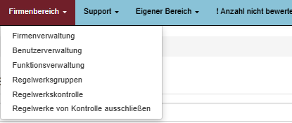 Unter diesem Menüpunkt können nun Firmenverwalter die firmeneigene Gruppen und Untergruppen anlegen und verwalten und in diesen die Firmenregelwerke zuweisen. Dazu ist im Firmenbereich der Menüpunkt “Regelwerksgruppen” zu wählen:
